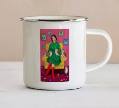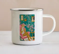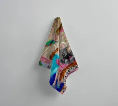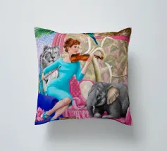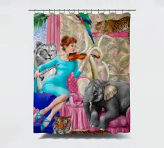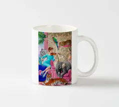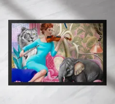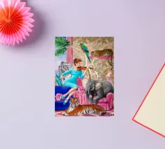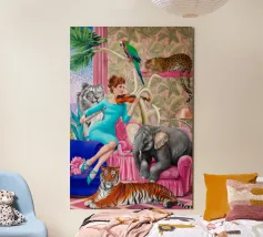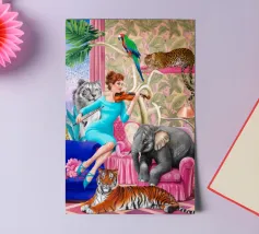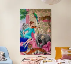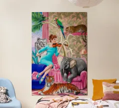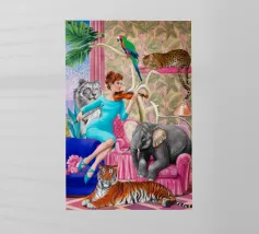 Una persona con i capelli scuri, vestita con un abito blu a fantasia, siede in mezzo a una fitta schiera di animali, tra cui una tigre, un elefante, pappagalli e altre creature, circondati da un fogliame rigoglioso.