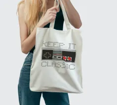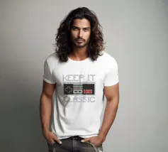 Un controller di gioco retrò è raffigurato con la frase "KEEP IT CLASSIC" in testo pixelato. Il design evoca la nostalgia grazie all'estetica vintage e alla semplice palette di colori.