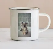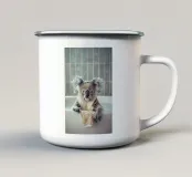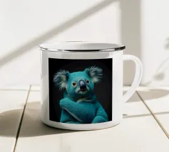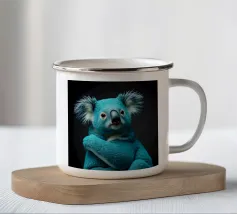 Un koala sbircia oltre il bordo di una vasca da bagno, aggrappandosi a una salvietta di pelo. Lo sfondo è caratterizzato da pareti piastrellate, che aggiungono un'ambientazione da bagno alla scena giocosa.