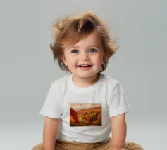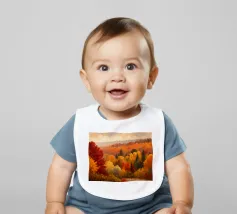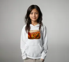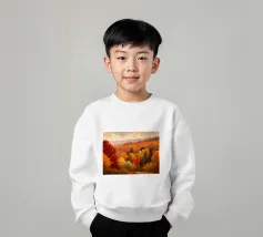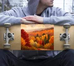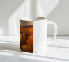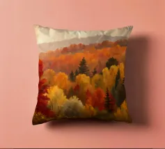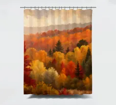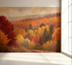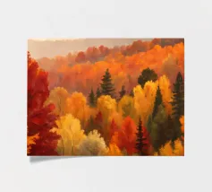 Questa immagine ritrae un vibrante paesaggio autunnale, catturando l'essenza del fogliame autunnale in uno stile pittorico. La scena è dominata da un ricco arazzo di colori caldi, principalmente arancioni, gialli e rossi, che rappresentano il cambiamento delle foglie degli alberi decidui. La composizione conduce l'occhio all'interno della scena, con un gruppo di alberi in primo piano, tra cui un albero prominente con foglie rosso intenso sulla sinistra. La foresta si estende fino al centro della scena, dove è visibile una varietà di specie arboree che mostrano una gamma di colori autunnali. Gli alberi sempreverdi spiccano con le loro tonalità di verde più scuro, fornendo un'immagine di cont
