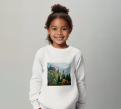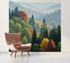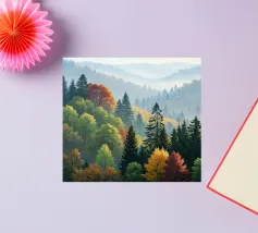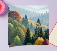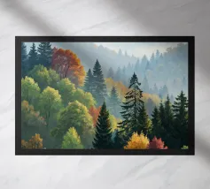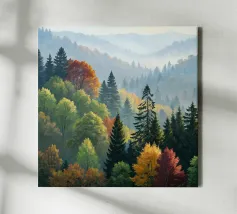 Questo dipinto a olio mozzafiato cattura la serena bellezza di una nebbiosa mattina d'autunno che scorre tra le montagne. Uno splendido arazzo di colori autunnali - dai rossi infuocati e arancioni profondi ai gialli vibranti e ai verdi verdeggianti - si stende sulle dolci colline. Pini imponenti fanno da sentinella tra gli alberi decidui, con le loro forme verde scuro che creano un contrasto sorprendente con le tonalità calde delle foglie che cambiano. Una nebbia soffice si fa strada tra le valli, conferendo alla scena una qualità eterea e sognante. Le cime lontane sfumano in un blu freddo e vaporoso, immerse nella luce delicata del sole nascente. Ti