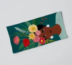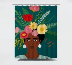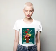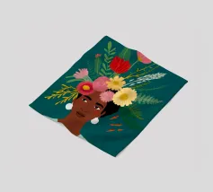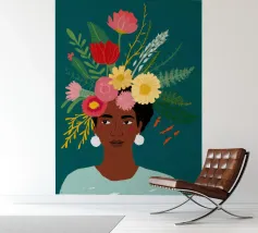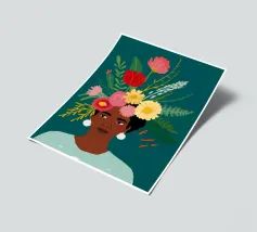Questa opera d'arte raffigura una persona circondata da piante e fiori, con il sole e le gocce di pioggia sullo sfondo. La scena trasmette un profondo legame con la natura.