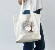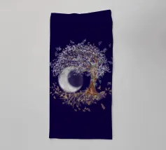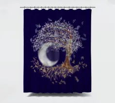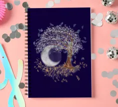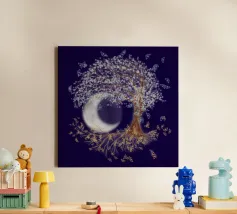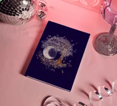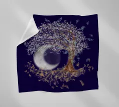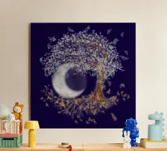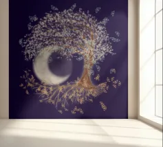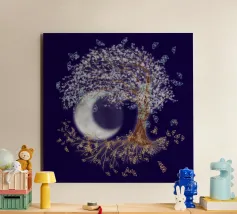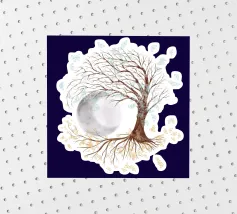 Collage digitale di un albero della vita inclinato con foglie bianche e farfalle blu. Anche nelle radici dell'albero si vedono farfalle, ma di colore arancione. Sullo sfondo si vede una grande luna