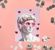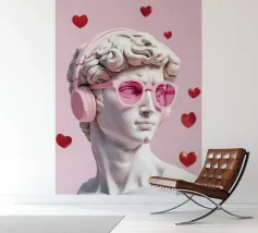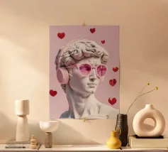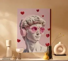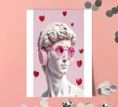 Celebrate la fusione tra arte senza tempo e stile moderno con questa giocosa reinterpretazione di un classico busto di marmo. Caratterizzato da cuffie rosa acceso, occhiali da sole abbinati e uno sfondo cosparso di accenti a forma di cuore, questo design irradia fascino e individualità. Perfetto per [prodotto], è ideale per i clienti che adorano le espressioni artistiche uniche che uniscono storia e cultura pop contemporanea. Un tocco audace di amore e creatività per il vostro spazio.