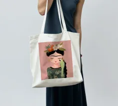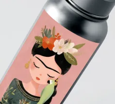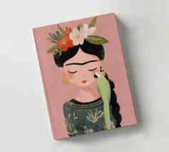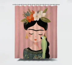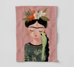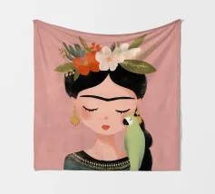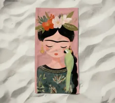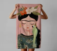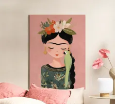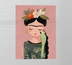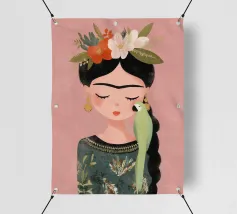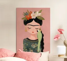 Frida Kahlo dispiega la sua essenza creativa in un ritratto affettuoso che mostra il suo pappagallo verde sulla spalla e i fiori nei suoi capelli intrecciati. Con gli occhi chiusi, irradia calma e grazia, perfetta per qualsiasi interno!