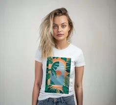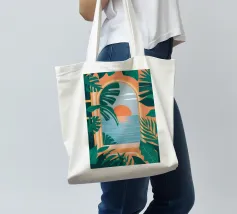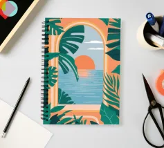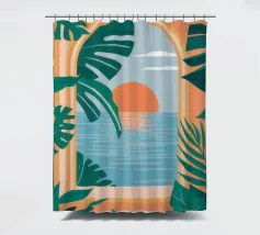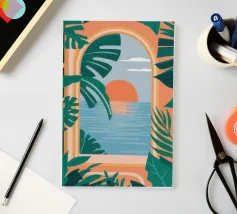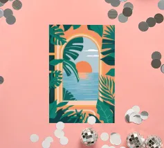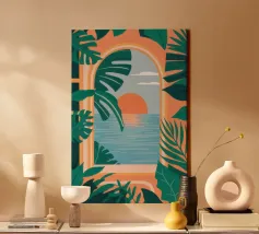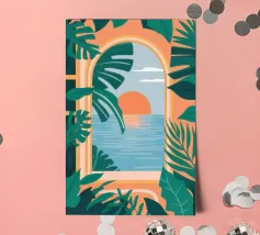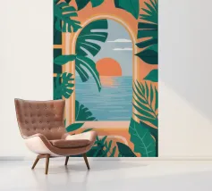 La vista attraverso un arco in terracotta, incorniciato da foglie tropicali, rivela un mare tranquillo e un sole al tramonto, che invita alla contemplazione pacifica.