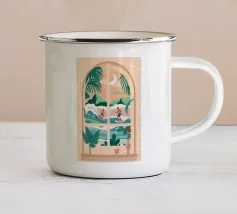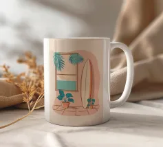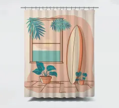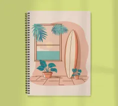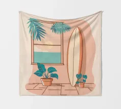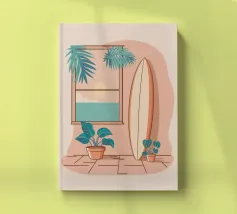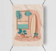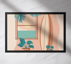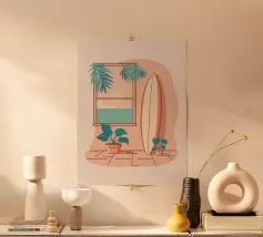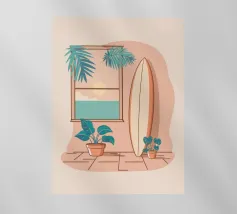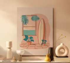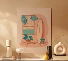 Una scena d'interni minimalista mostra un semplice arco, una finestra con vista su una singola nuvola e una pianta in vaso, evocando un senso di pace e tranquillità.