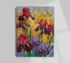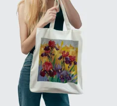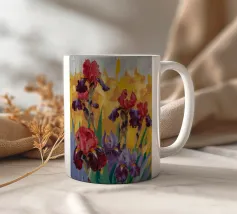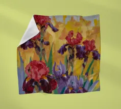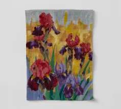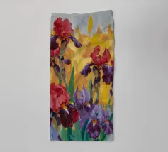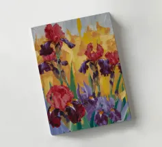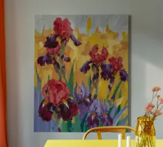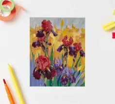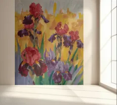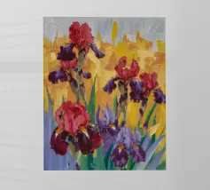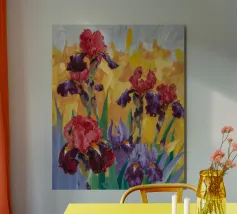 Un dipinto di grande impatto si concentra su alti e vibranti iris viola e gialli su uno sfondo luminoso e astratto, mostrando la loro forma maestosa e i loro colori intensi con pennellate audaci ed espressive.