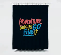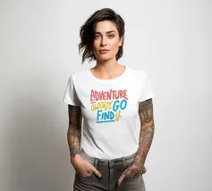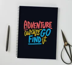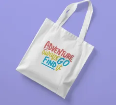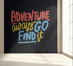 Una divertente scritta rossa, gialla e blu con la frase "Adventure Awaits Go Find It". Un regalo perfetto per gli amanti dei viaggi.