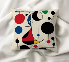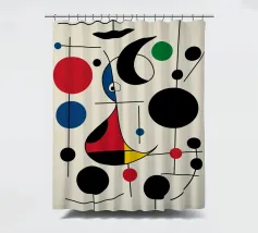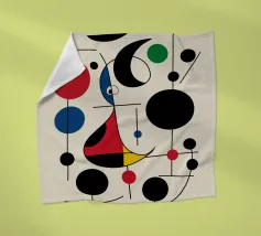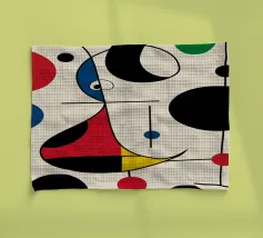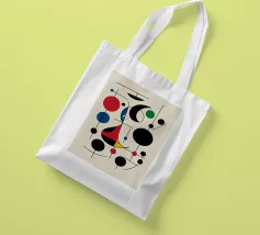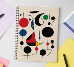 Una composizione astratta caratterizzata da forme geometriche audaci e colori primari, come il rosso, il blu, il verde e il giallo. La composizione comprende cerchi, linee e curve che creano un senso di movimento ed equilibrio.