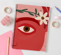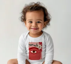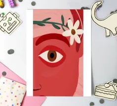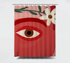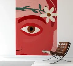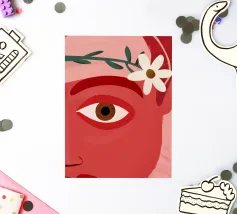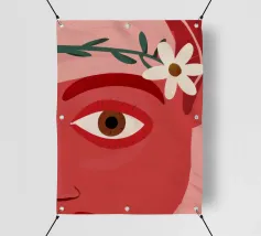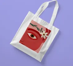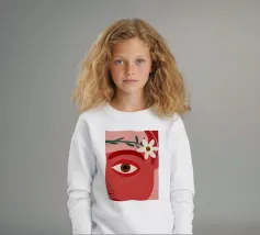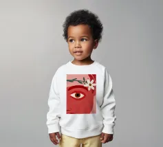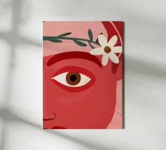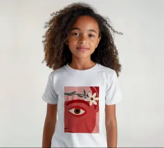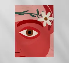 Una composizione surreale e artistica con un grande occhio singolo al centro di un fiore bianco stilizzato. L'opera è collocata su uno sfondo rosso, creando un'immagine audace, stimolante e leggermente misteriosa.