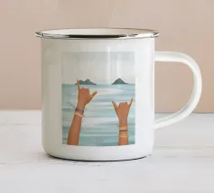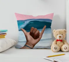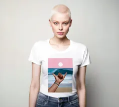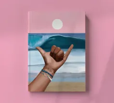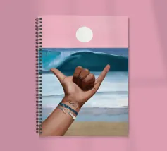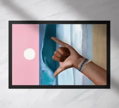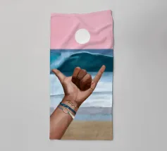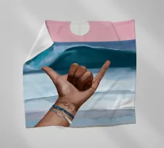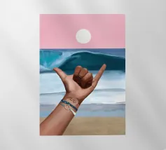 Un dipinto vibrante che cattura lo spirito rilassato della cultura del surf. Sullo sfondo di un cielo rosa da sogno e di un'onda blu, una mano lancia l'iconico segno dello shaka, che simboleggia la "libertà" e l'energia aloha. Il sole è basso e risplende sull'orizzonte calmo dell'oceano. Con braccialetti ispirati all'oceano e un sottile tatuaggio a forma di onda, il primo piano aggiunge un'atmosfera personale e vissuta. La composizione fonde blocchi di colore puliti con texture espressive del pennello, creando un tributo audace ma sereno alla vita da spiaggia, alla libertà costiera e all'anima dell'acqua salata.