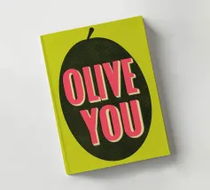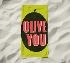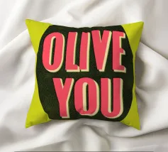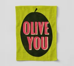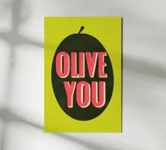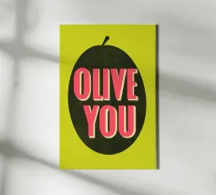 Questo spiritoso motivo pop art a forma di oliva combina il design tipografico con un giocoso messaggio d'amore. La scritta "Olive You" gioca in modo affascinante con le parole ed è in rosa acceso su uno sfondo verde brillante. Una moderna dichiarazione di umorismo, colore e amore in stile retrò.