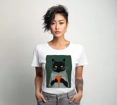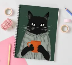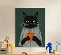 Un ritratto affascinante e stravagante di un sofisticato gatto nero dai lunghi baffi, che tiene educatamente in mano una piccola tazza di tè arancione. La semplice composizione è carina, divertente e piena di carattere.
