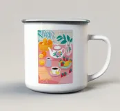 Una natura morta allegra e colorata di una scena di tè, con una teiera, tazze, arance e pasticcini su un tavolo rosa. Lo stile giocoso e i colori vivaci creano una sensazione di calore e felicità.