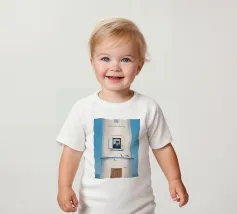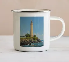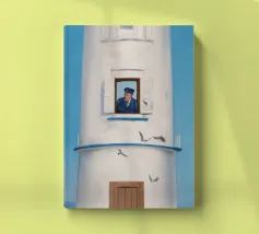 Un uomo guarda dalla finestra superiore di un semplice faro bianco contro un cielo azzurro e limpido, evocando i temi della solitudine, della vigilanza e del mare.