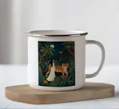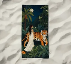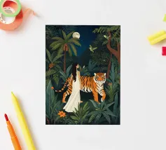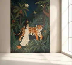 Un dipinto acrilico ipnotico cattura una donna in un fluente abito bianco, che si aggira con grazia in una giungla lussureggiante sotto un cielo notturno stellato. La luna piena proietta un bagliore magico, illuminando il suo cammino accanto a una tigre imponente, un pappagallo vivace e una scimmia giocosa. Le piante esotiche incorniciano la scena, creando un'atmosfera incantevole che invita gli spettatori a fuggire in questo mondo selvaggio e stravagante. Perfetto per chi desidera l'avventura e un tocco di fantasia.
