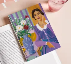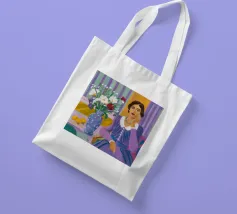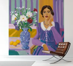 Come in un dipinto classico, una donna pensierosa in un elegante abito viola siede a un tavolo con un vaso di fiori e una ciotola di limoni.