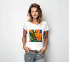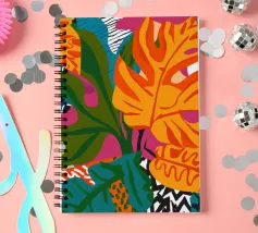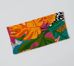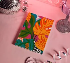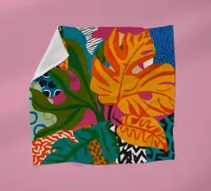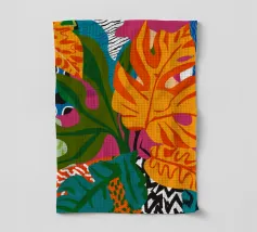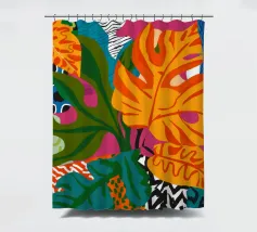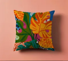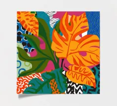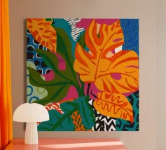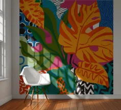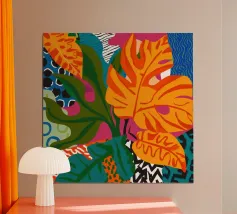 Un motivo lussureggiante e intricato di foglie tropicali, dominato dalle tonalità dell'arancione, del verde acqua e del rosa, che crea una composizione vibrante e simile a un labirinto nella giungla.