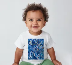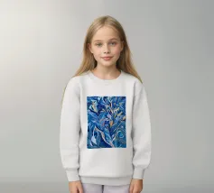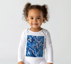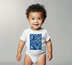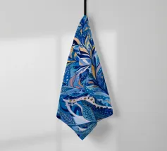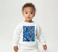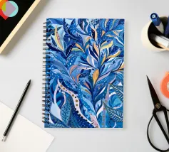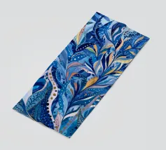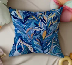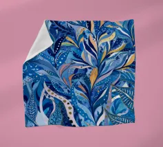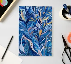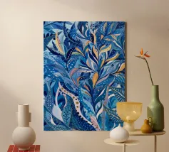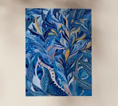 Una composizione densa e intricata incentrata su foglie stilizzate, forse felci o acanto, rese in varie tonalità di blu profondo, che creano un ipnotico labirinto naturale.