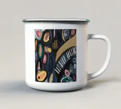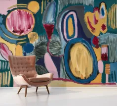 Un complesso e intricato disegno astratto con forme a U, cerchi e linee in una tavolozza di blu, gialli, rosa e viola che formano un disegno vibrante e labirintico.