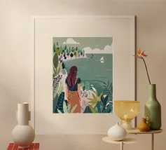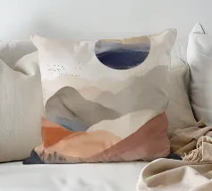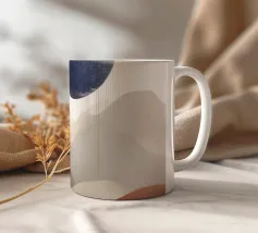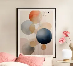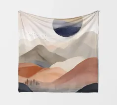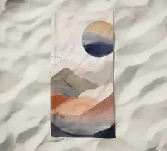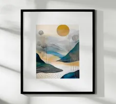 Questo tranquillo paesaggio astratto fonde i toni tenui della terra con texture fluide, offrendo un senso di calma e bellezza senza tempo. I caldi ruggini, i morbidi beige e i profondi blu navy sono abbinati a un audace elemento circolare, che ricorda un corpo celeste, creando un disegno moderno ma sereno. Dettagli sottili, come sottili increspature lineari e deboli sagome di alberi, aggiungono profondità ed equilibrio a questa composizione minimalista.