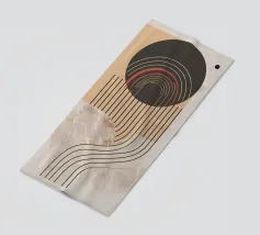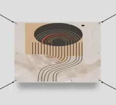 Una composizione geometrica presenta un grande cerchio con archi concentrici, intersecato da linee verticali e ondulate che scorrono su uno sfondo beige e strutturato. L'uso di colori audaci come il nero, il marrone e il rosso crea un contrasto sorprendente. Il disegno ha un'estetica moderna e astratta.