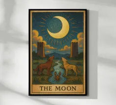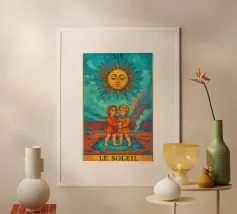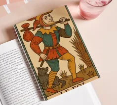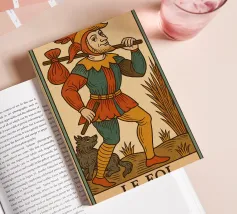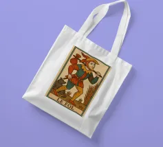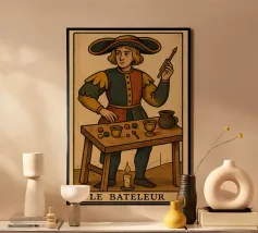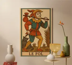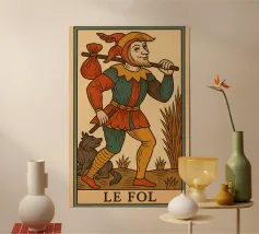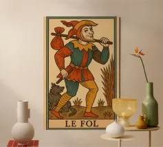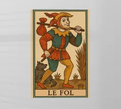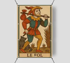 Questa rivisitazione dei tarocchi "Le Fol" (Il Matto) unisce un surrealismo stravagante a un'illustrazione lussureggiante e moderna. In mezzo a un fogliame vivacemente stilizzato, il Matto indossa un abito gessato e un casco aperto, evocando sia un viaggiatore che un sognatore. La sua chitarra si trasforma in un oggetto ibrido che assomiglia a un fucile, mentre un porta armonica al collo aggiunge un tocco musicale. Nuvole fumose si arricciano sullo sfondo, esaltando il tono misterioso e avventuroso della scena. La carta cattura uno spirito di eccentricità e vagabondaggio, suggerendo un viaggio guidato dall'istinto, dall'arte e da scelte audaci e non convenzionali.