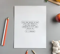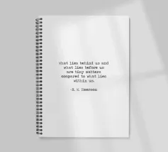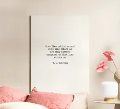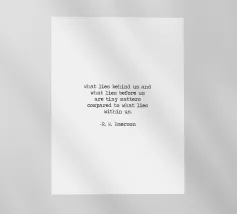 "Ciò che sta dietro di noi e ciò che sta davanti a noi sono piccole cose rispetto a ciò che sta dentro di noi" Ralph Waldo Emerson famosa citazione filosofica minimalista in bianco e nero tipografia word art.