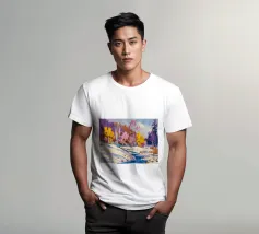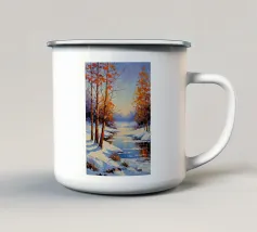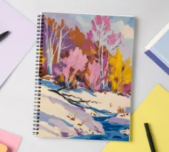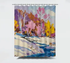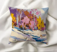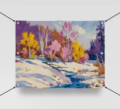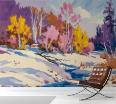 Un suggestivo paesaggio invernale in cui un primo piano innevato con un ruscello o un sentiero tortuoso incontra alberi ancora aggrappati alle ultime vestigia delle foglie rosa e gialle dell'autunno, con lontane colline viola che aggiungono profondità.