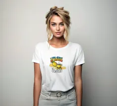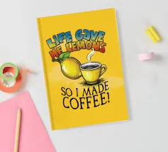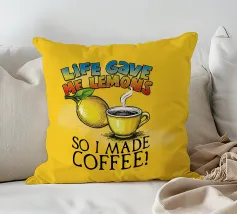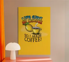 Un'opera d'arte umoristica con un vivace sfondo giallo, un limone, una tazza di caffè fumante e un testo scherzoso che recita "Life Gave Me Lemons So I Made Coffee". Perfetto per progetti motivazionali o spensierati.