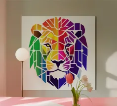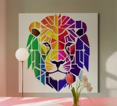 Una maestosa dichiarazione di colore: questa testa di leone geometricamente sezionata combina la potenza espressiva dell'estetica vettoriale digitale con il simbolismo dell'orgoglio, della forza e della diversità. Gli intensi colori dell'arcobaleno ricordano la moderna street art e la cultura LGBTQ+, mentre le linee pulite riflettono influenze techno e futuristiche. Un poster per tutti coloro che prendono coraggiosamente posizione: potente, moderno e imperdibile.
