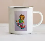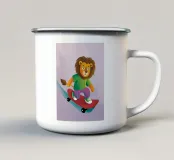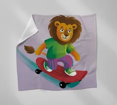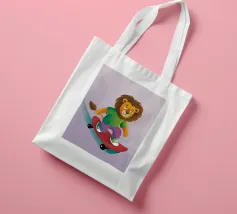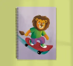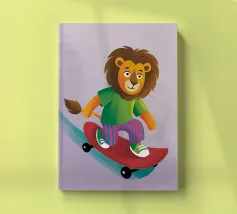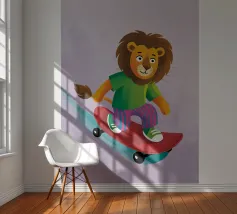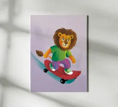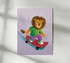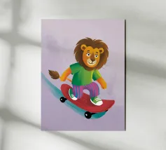 Un energico leone su uno skateboard, con una maglietta verde e pantaloni a righe colorate. Questa illustrazione divertente e colorata piacerà ai bambini e agli appassionati di scene di animali stravaganti. Perfetta per la cameretta di un bambino o per un arredamento divertente e dinamico. Il disegno unisce umorismo, sportività e cartoni animati per un tocco di buonumore su ruote.