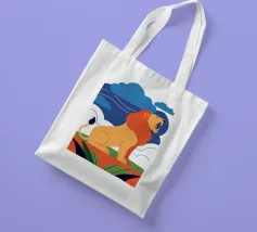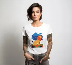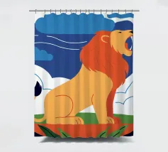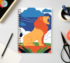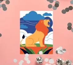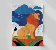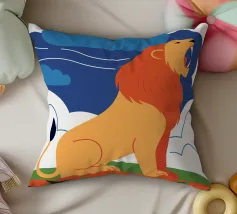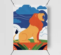 Godetevi una vibrante illustrazione della fauna selvatica con un leone che ruggisce con nuvole e colline sullo sfondo.