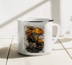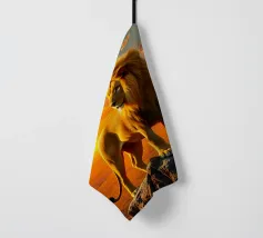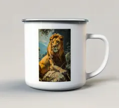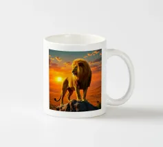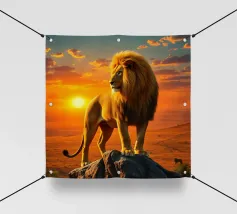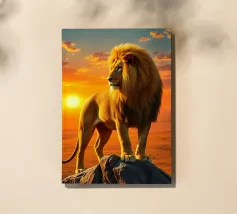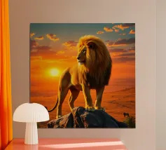 Una suggestiva immagine di un leone dalla testa d'oro che osserva la savana africana da uno sperone roccioso. L'immagine cattura il caldo tramonto e la potente presenza del leone con dettagli iperrealistici.