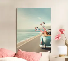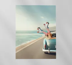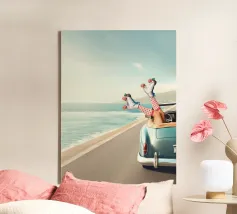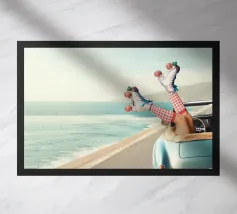 Sperimentate la massima libertà e avventura con le nostre opere d'arte vintage. Sentite il sole sulla pelle mentre guidate lungo la costa in una classica decappottabile. Immaginate il vento tra i capelli mentre una pattinatrice spensierata scivola sull'oceano. Questo capolavoro cattura la nostalgia di un viaggio in auto retrò e vi avvicina alla bellezza di una vita senza limiti. Perfetto per ogni appassionato di arte e avventura".