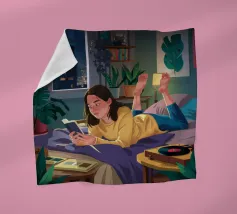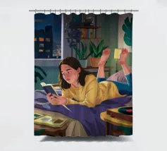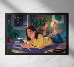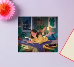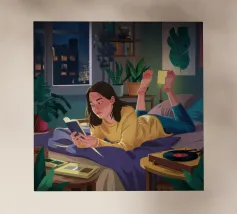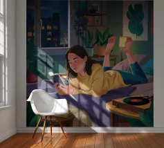 Una persona legge un telefono o una tavoletta luminosa in una camera da letto accogliente e poco illuminata di notte. La luce calda dello schermo e di una piccola lampada crea un'atmosfera intima e tranquilla per la lettura notturna.