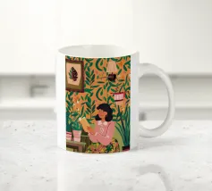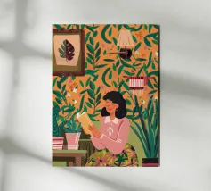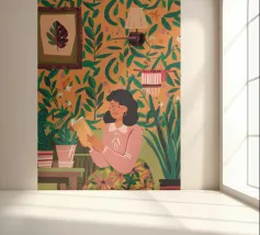 Una donna trova un momento di tranquillità per leggere, circondata da piante rigogliose e da un gatto curioso, sullo sfondo di una bellissima carta da parati ispirata alla natura.