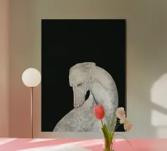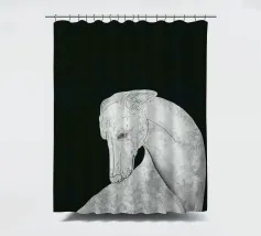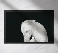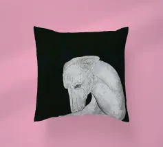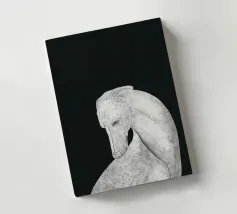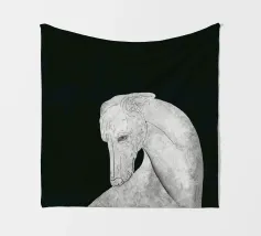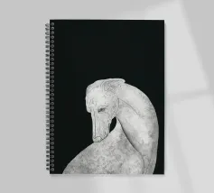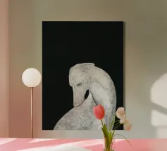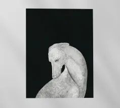 Un levriero dalle curve aggraziate, con una superficie grigia strutturata, si staglia su uno sfondo nero, che trasmette eleganza e semplicità. Linee delicate definiscono il muso del cane, sottolineando il suo atteggiamento contemplativo.