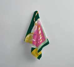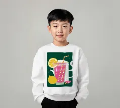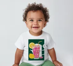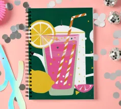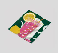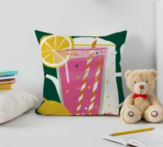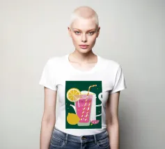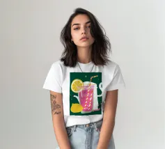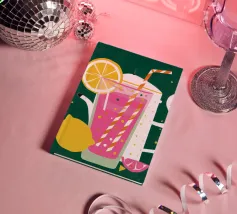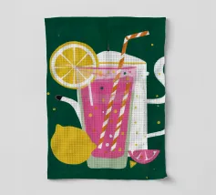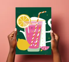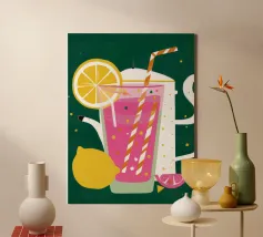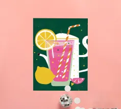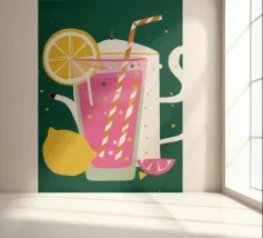Un bicchiere alto e rinfrescante di limonata rosa con cannuccia e fetta di limone, illustrato in uno stile grafico e audace su uno sfondo scuro con forme geometriche.