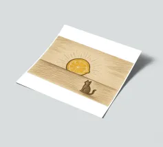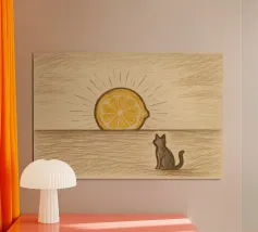 Sotto un sole agrumato, un piccolo gatto curioso se ne sta fermo, ipnotizzato dal limone luminoso all'orizzonte. La scena è stravagante ma tranquilla, come se il mondo fosse diventato zuccheroso e luminoso solo per questo momento. Un tocco giocoso alla serenità del tramonto, dove i baffi incontrano la luce dell'anima.