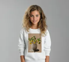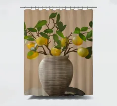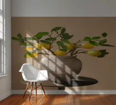 Una natura morta fresca e vivace con un vaso di ceramica pieno di rami di limone. Con i suoi toni caldi e lo sfondo minimalista, quest'opera d'arte porta il fascino mediterraneo e la bellezza naturale in qualsiasi cucina o spazio abitativo.