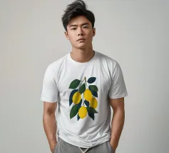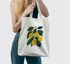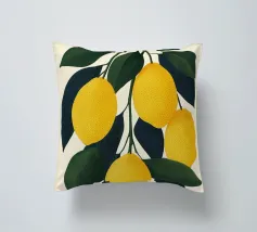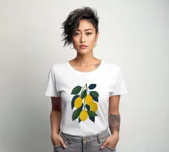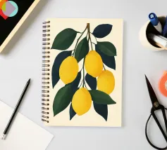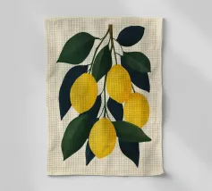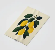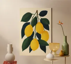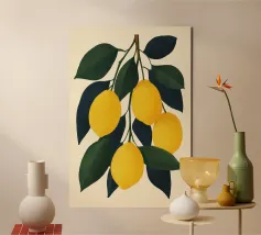 L'immagine mostra una bella illustrazione botanica di limoni gialli e maturi appesi a un ramo. I limoni hanno una superficie leggermente strutturata e sono circondati da foglie verde scuro, vivide e dettagliate. Lo sfondo è semplice e luminoso e mette in risalto i limoni e le foglie.