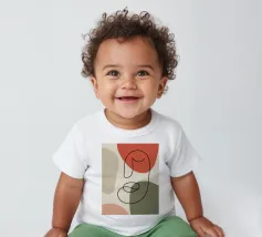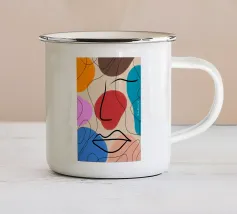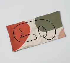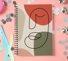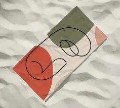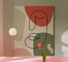 Forme astratte nei toni della terra, come il rosso, il verde e il beige, sono sovrapposte a una linea nera continua che forma un disegno minimalista. La composizione unisce la semplicità a uno stile espressivo.