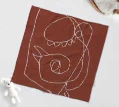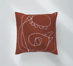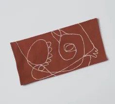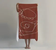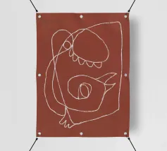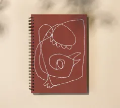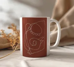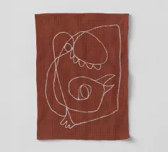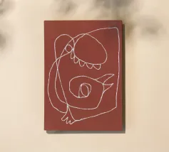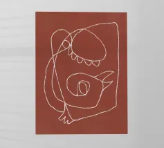Una serie di linee bianche su uno sfondo marrone rossastro forma un disegno astratto che assomiglia a un capriccioso disegno a linee continue. La composizione presenta anse e curve che possono suggerire la presenza di figure e forme astratte o semplificate.