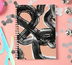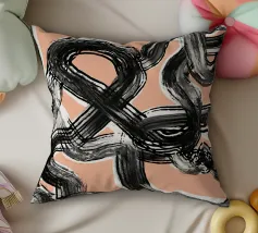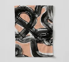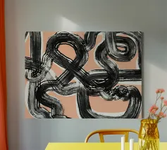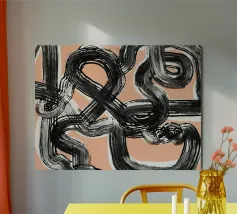 Tratti neri audaci e intrecciati creano una rete astratta di forme su uno sfondo chiaro e color pesca. Alcuni tratti sono fortemente ombreggiati, dando un senso di profondità, mentre altri appaiono più abbozzati e leggeri.