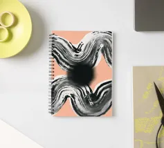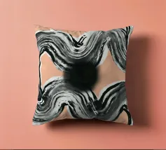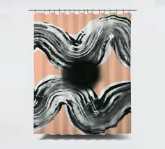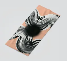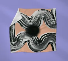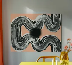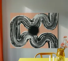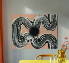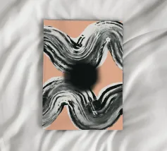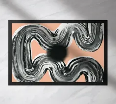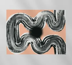 Ampie e fluide pennellate in bianco e nero si susseguono su uno sfondo color pesca, formando forme interconnesse ad anello. Il contrasto tra le forme astratte e lo sfondo piatto crea un senso di movimento e di ritmo.