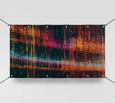 Questa composizione presenta un'intricata esposizione di linee e motivi colorati, mescolando vibranti tonalità di rosso, arancio e blu che evocano un senso di dinamismo ed energia.