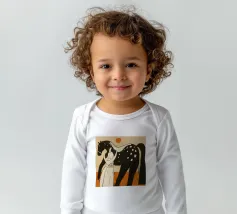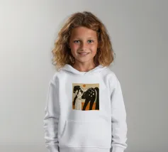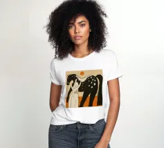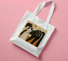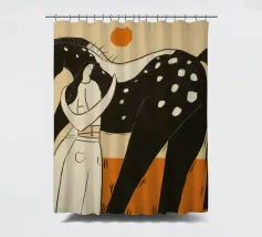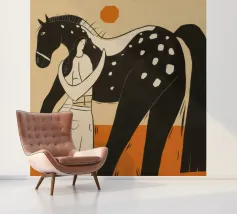 Illustrazione stilizzata di una persona in piedi tra due cavalli, uno nero con macchie bianche e uno bianco, in una composizione che enfatizza linee e forme semplici.