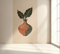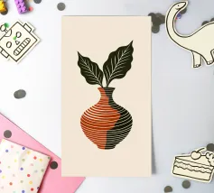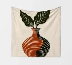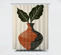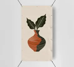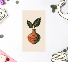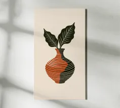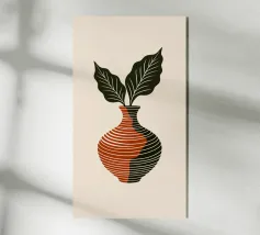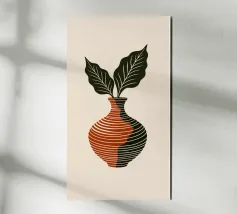Portate a casa vostra un tocco di moderna raffinatezza ed eleganza naturale con questa suggestiva stampa d'arte. Questo pezzo presenta un disegno unico e astratto di un vaso diviso in due sezioni distinte. Un lato è una terracotta calda e terrosa, mentre l'altro è un nero deciso, entrambi ornati da intricate linee orizzontali ondulate che creano un senso di movimento e consistenza. Due foglie stilizzate di colore verde scuro emergono dalla parte superiore, aggiungendo un elemento organico semplice e grazioso. Perfetta per un'estetica minimalista, bohémien o moderna di metà secolo, questa stampa è un'aggiunta versatile a qualsiasi salotto, camera da letto o ufficio,